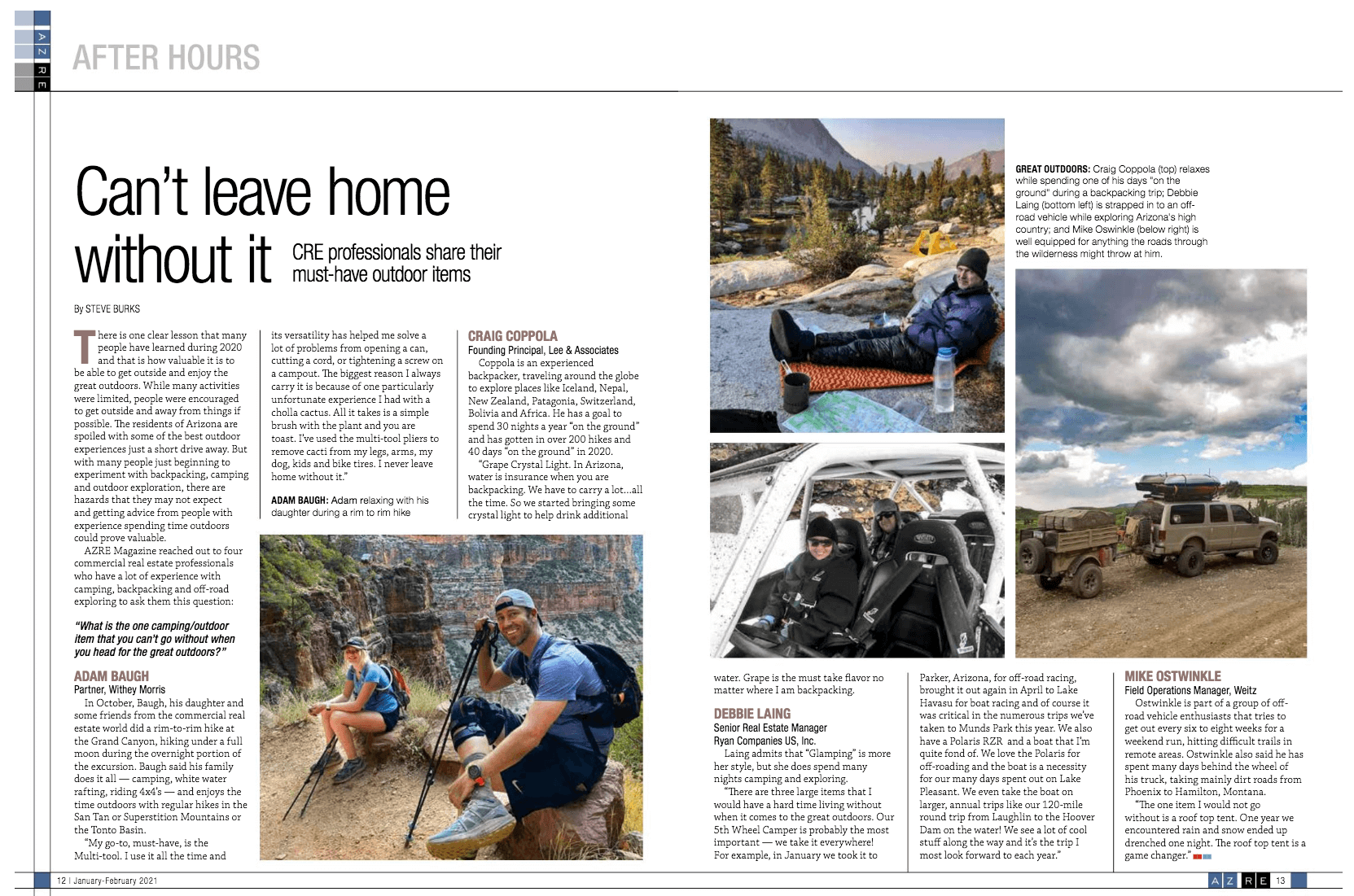 In October, Baugh, his daughter, and some friends from the commercial real estate world did a rim-to-rim hike at the Grand Canyon, doing a hike under a full moon during the overnight portion of the excursion. Baugh said his family does it all – camping, white water rafting, riding 4×4’s and enjoys the time outdoors with regular hikes in the San Tan or Superstition Mountains or the Tonto Basin. Read more